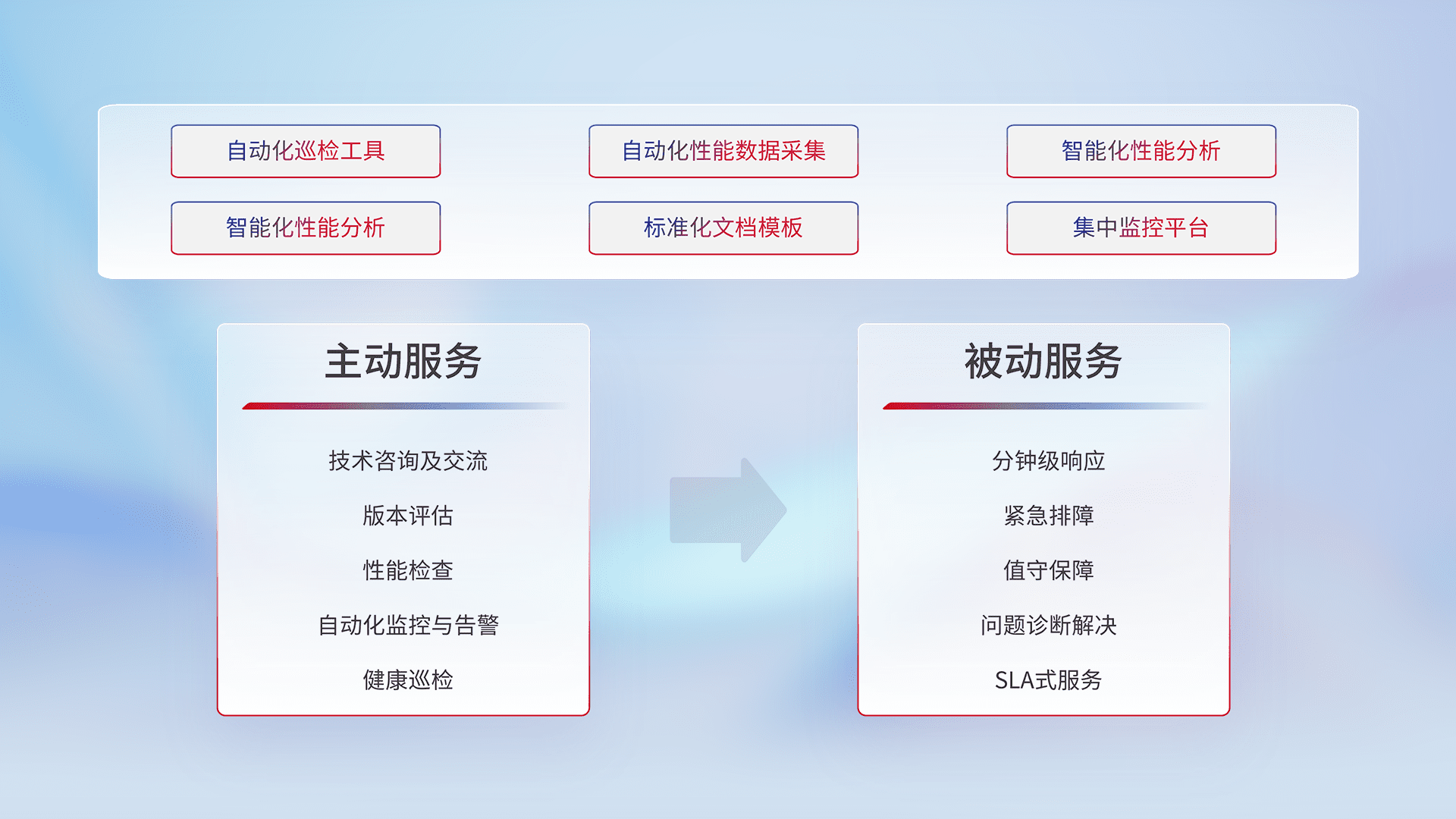 智能化工具和标准化文档,,,,保障服务质量,,提供主动服务(包含技术咨询、、、、版本评估、、、性能检查、、、自动化监控与告警、、、、健康巡检)和被动服务包含(分钟级响应、、、、紧急排障、、、、值守保障、、问题诊断解决、、SLA服务)。。